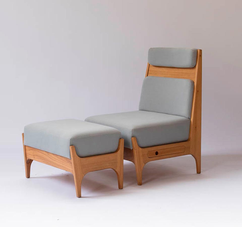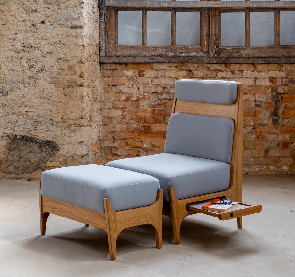 A Poltrona Camila envolve seu usuário em conforto, sendo produzida em madeira, com tecido macio e recheio de pluma, proporcionando uma sensação aconchegante.
